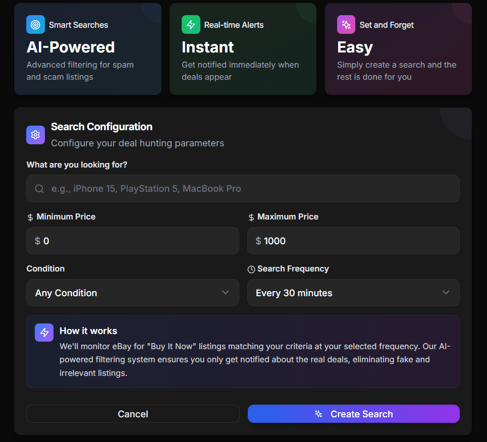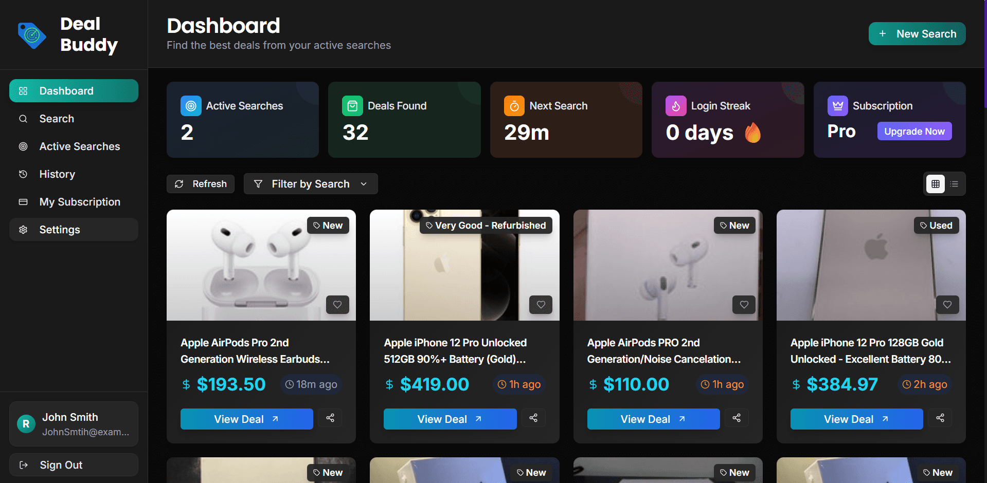 Deal Buddy delivers a seamless, efficient experience for finding the best deals on Facebook Marketplace and Ebay. Instant alerts, smart filtering, and a sleek, user-friendly design.